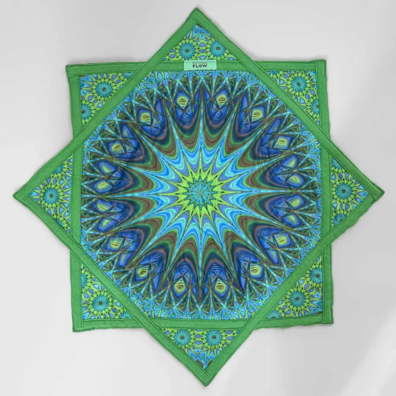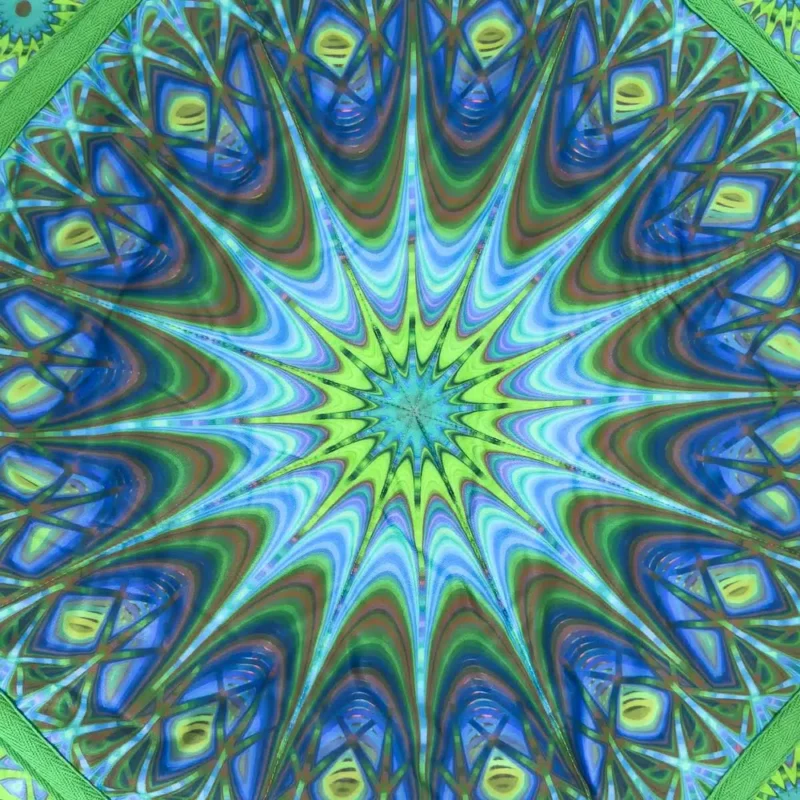 The Crystal Lotus Flow Star (aka Dapo Star) features an eye-catching geometric design resembling a symmetrical web or star, glowing vibrantly under UV light in emerald green and blue tones. This flat, lightweight spinning disc is crafted for smooth and effortless spinning, perfect for elevating your flow arts practice or adding visual impact to performances.