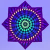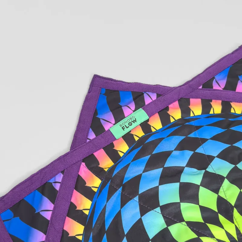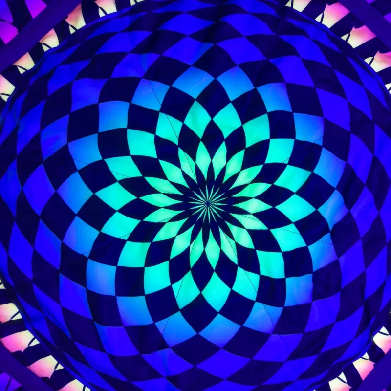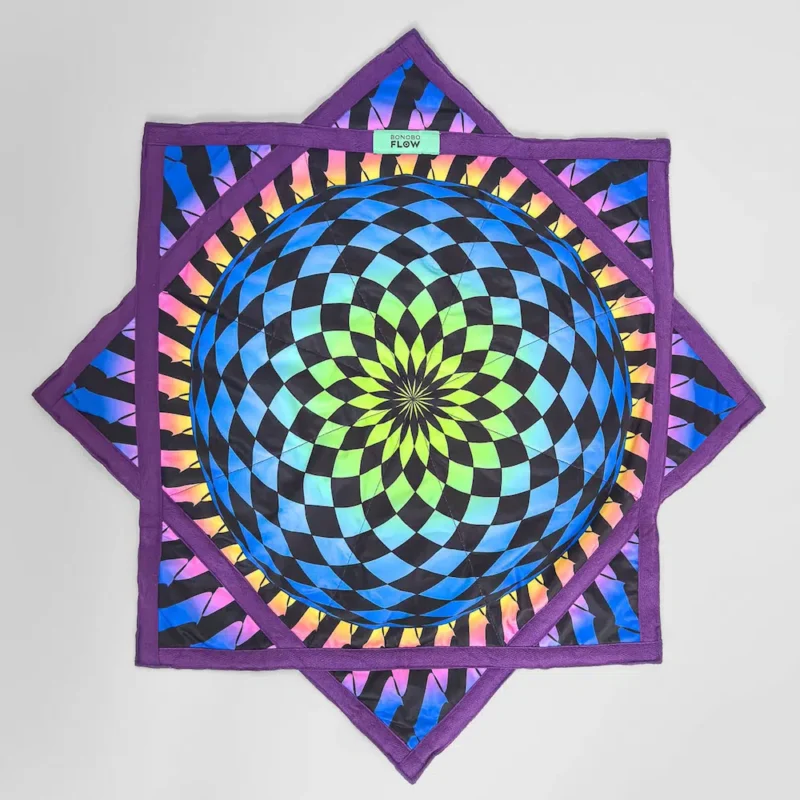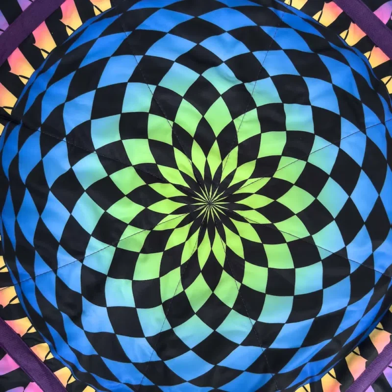 The Harlequin Halo Flow Star (aka Dapo Star) features a dynamic, circus-inspired design. At its center is a spiraling checkerboard pattern alternating between black and vibrant colors—emerald green near the center, transitioning to blue further outward. Encircling this checkerboard spiral is a striking bright-yellow glow, accented with subtle hints of purple near the outer edges, reminiscent of a radiant sun. Designed as a flat, lightweight spinning disc, this Flow Star offers smooth, effortless spinning to enhance your flow arts practice or performances.