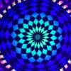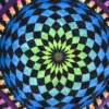 - Spiraling checkerboard pattern in black, emerald green, and blue