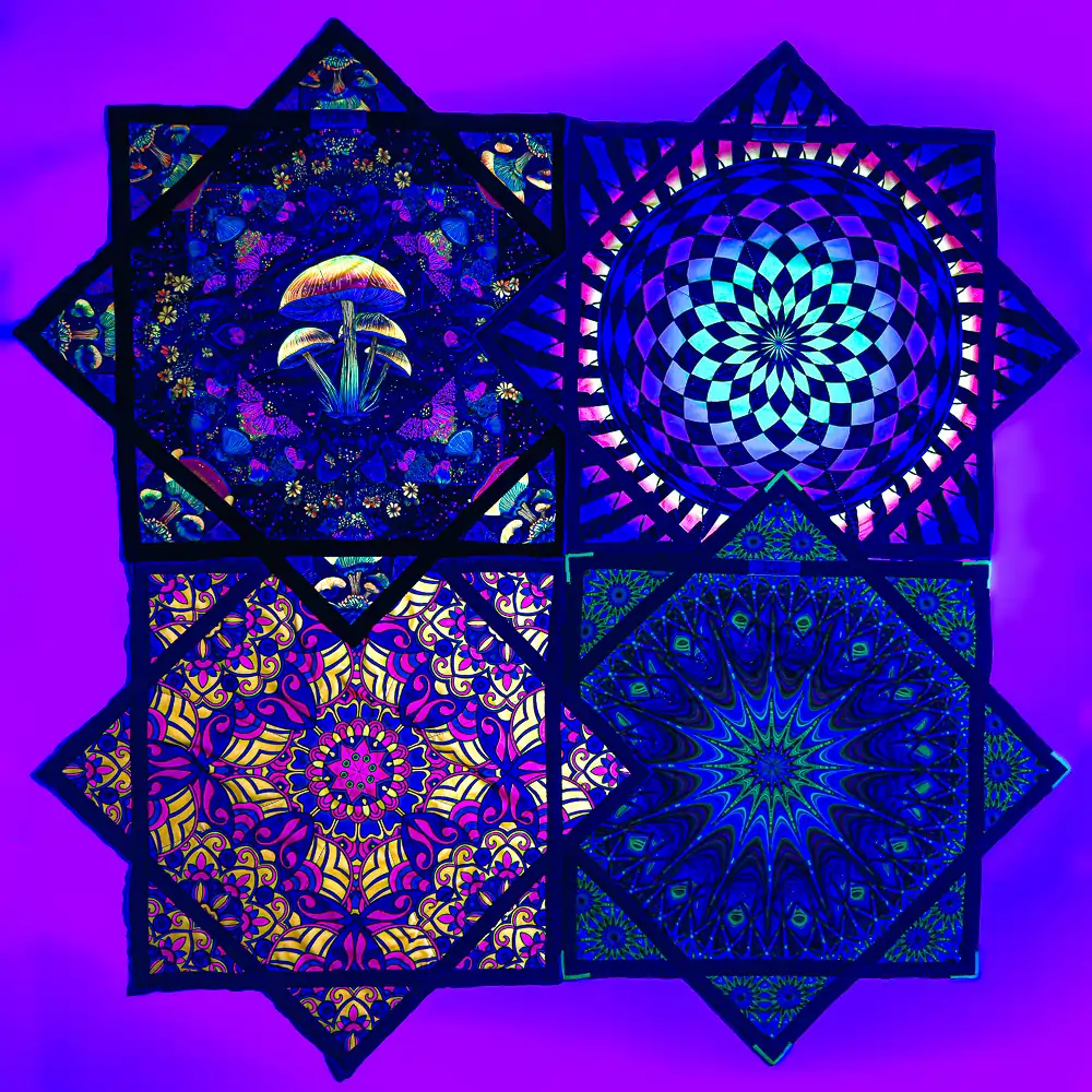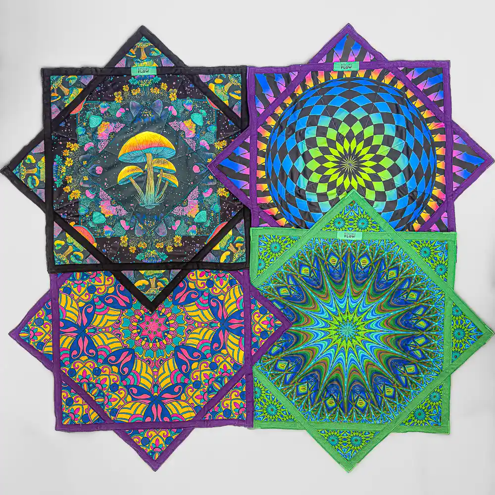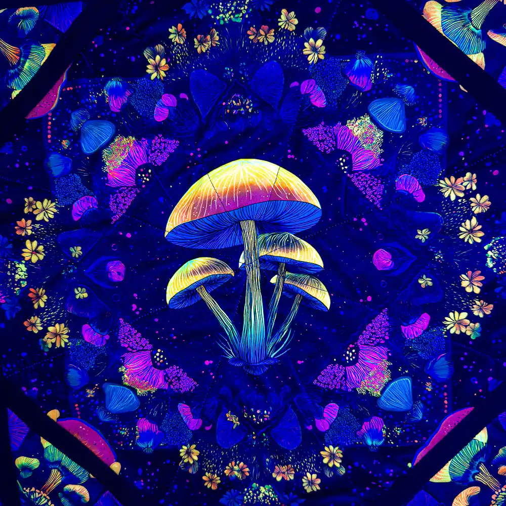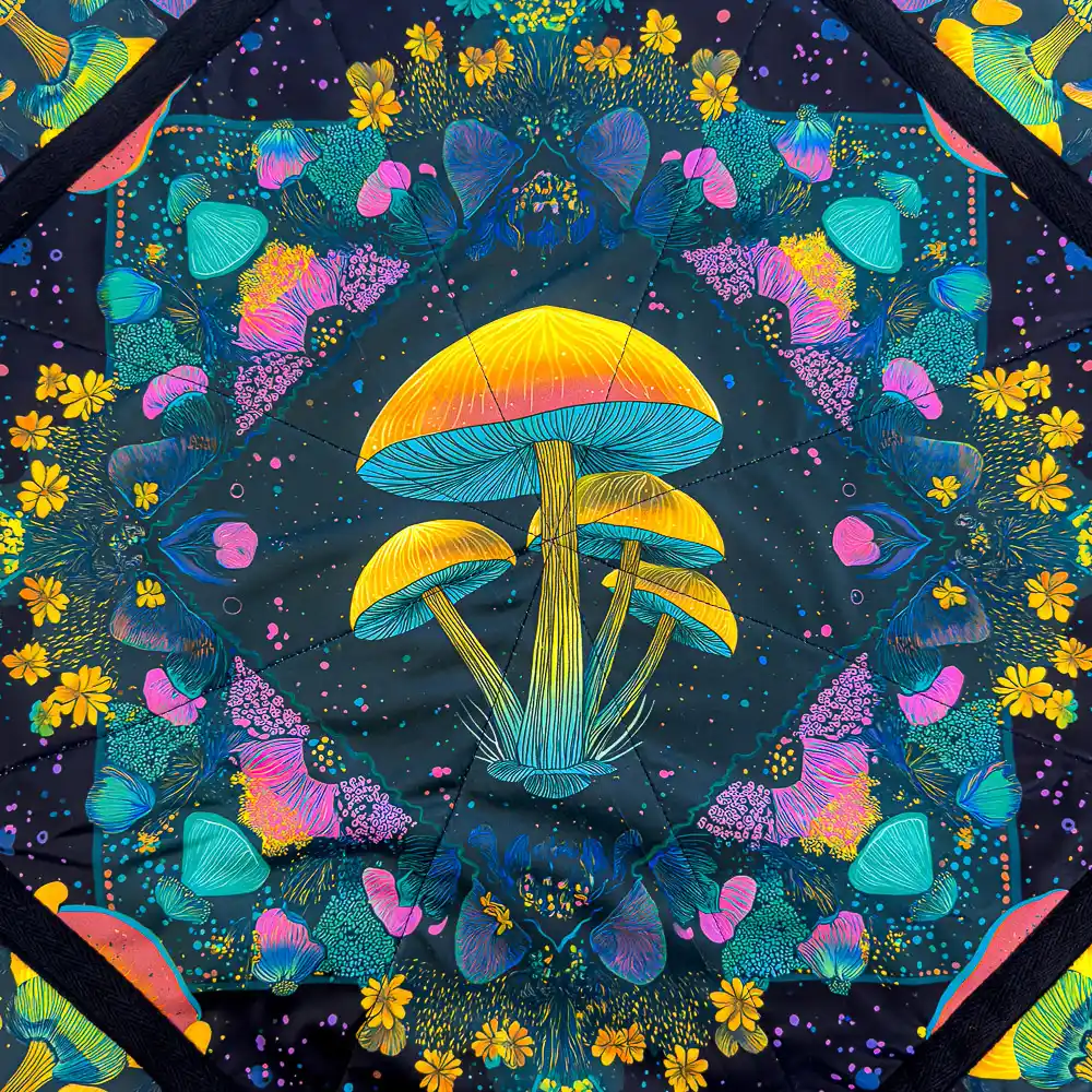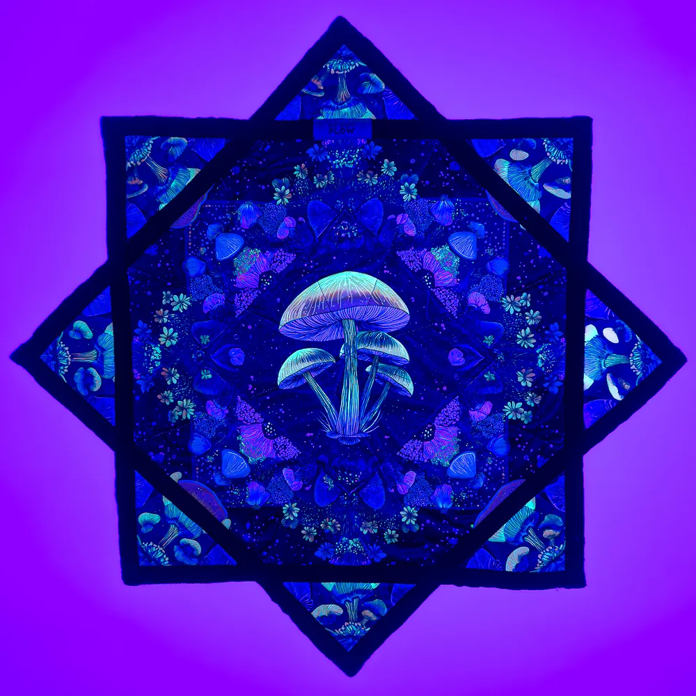 The Mushroom Bloom Flow Star features a psychedelic neon mushroom design layered with floral patterns in a cosmic, galactic setting. This one was designed to hit that balance between trippy and classy. The dark background makes the neon colors pop hard, especially under black light, without feeling chaotic or overdone.