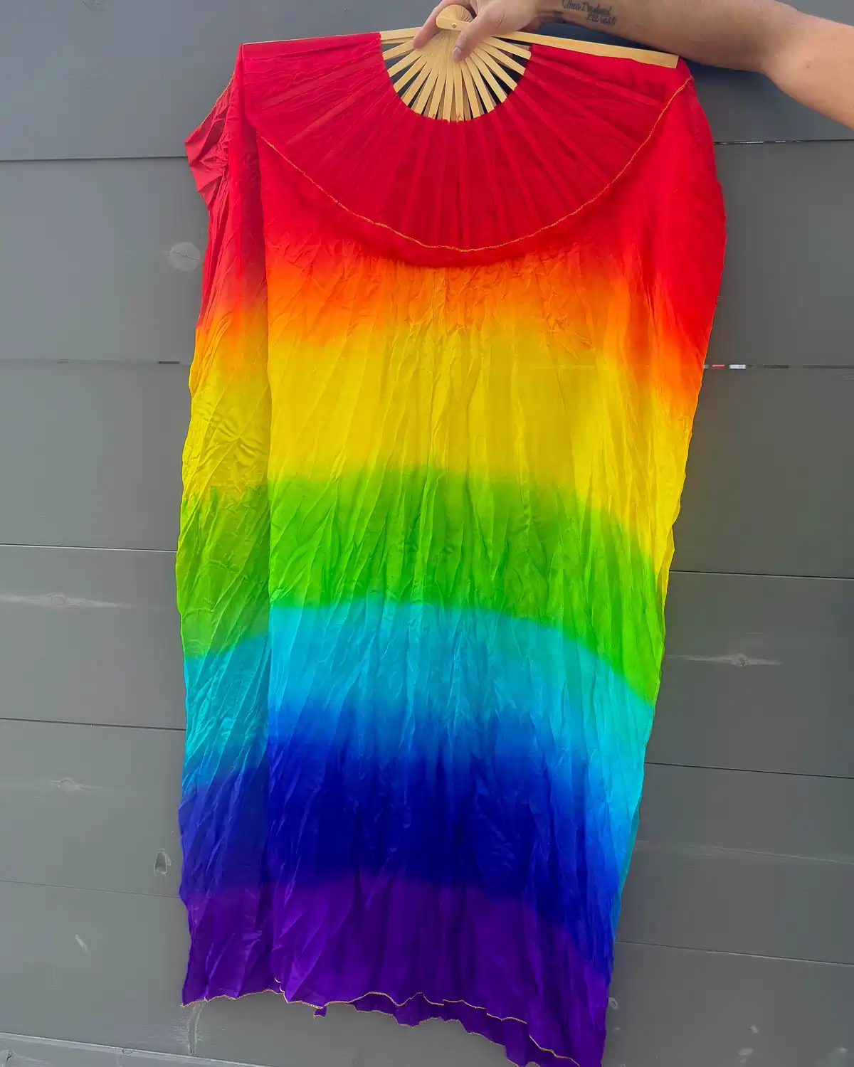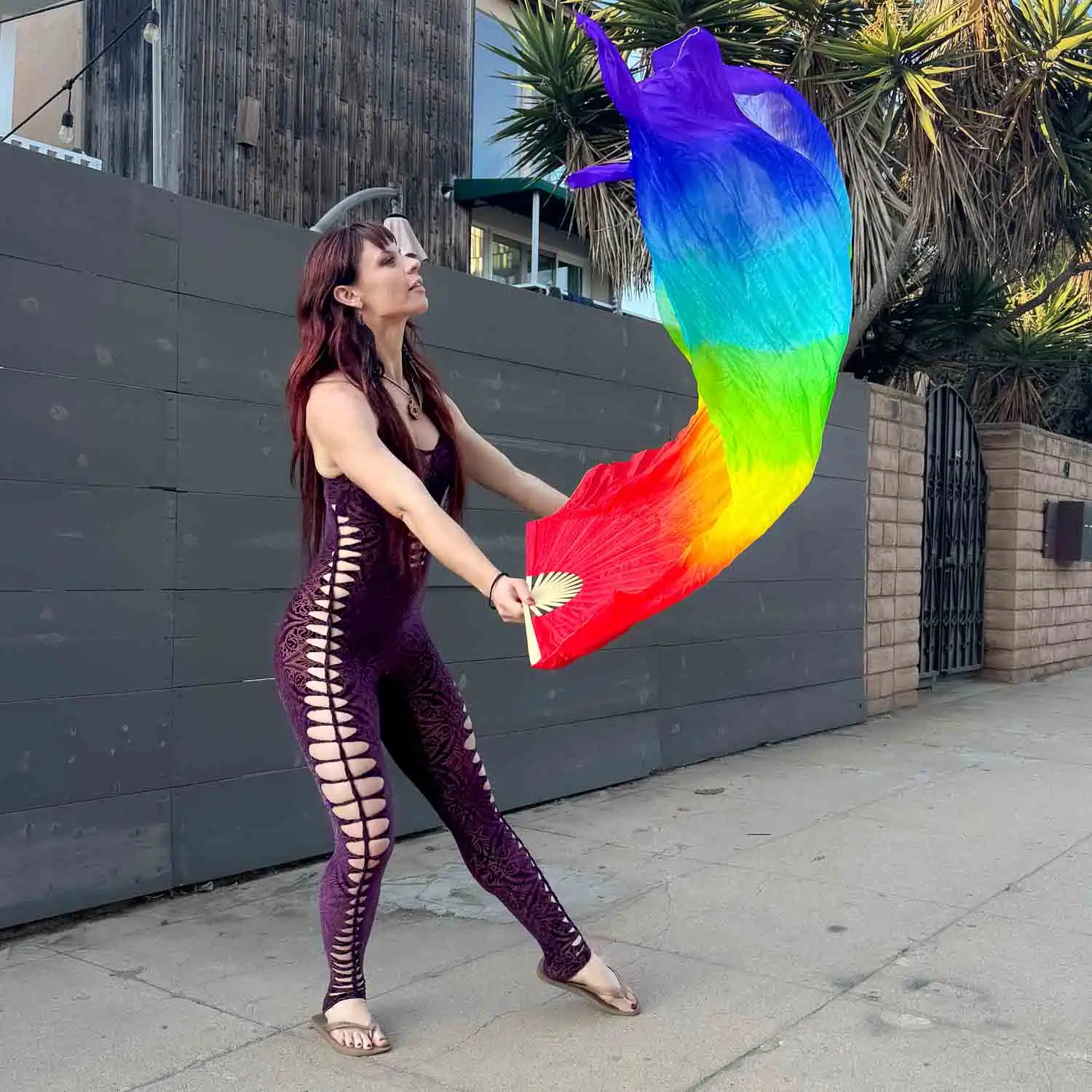Silk veil fans, also called silk fans, are perfect for adding a touch of elegance to your flow and dance. They’re made with lightweight 100% mulberry silk that moves beautifully as you do, creating interesting visual effects. Whether you’re new to flow arts or an experienced dancer, these fans are a great way to explore movement and expression. They come in a variety of colors and patterns, so you can find the perfect ones to complement your style. These props are getting very popular with flow artists, gogo dancers, burlesque artists, and more!